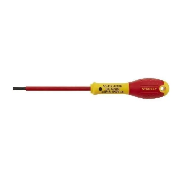 El destornillador electricista aislado Fatmax 1000V 4x100mm de la marca Stanley es una herramienta profesional para trabajos eléctricos que ofrece seguridad hasta 1000 voltios. Este destornillador plano es impecable para trabajos de precisión.Especificaciones