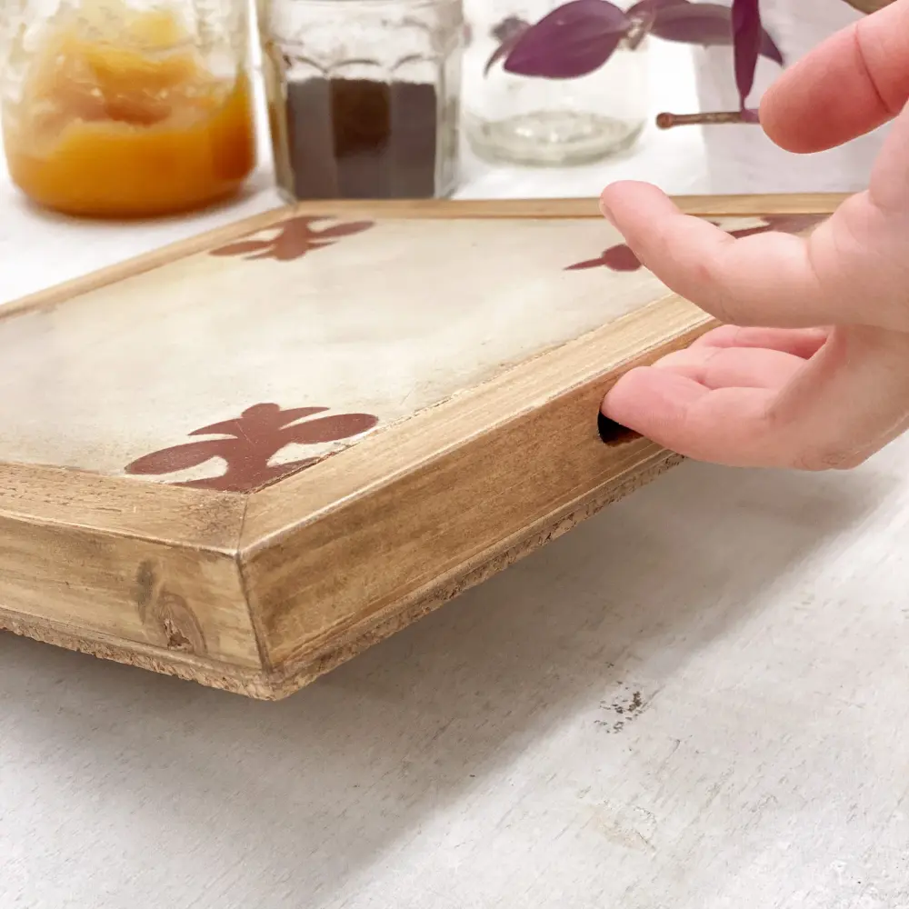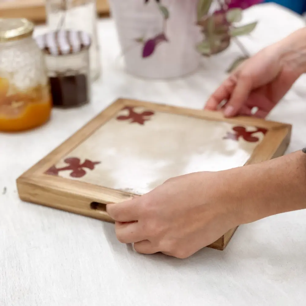 El salvamanteles cuenta con un barniz apto para uso alimentario que, junto a un par de orificios para los dedos que facilitan su transporte, hacen de él un producto útil y decorativo al mismo tiempo.