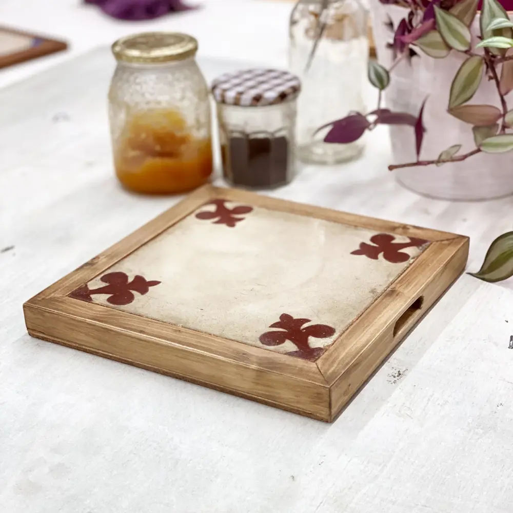En este salvamanteles SUA, integramos 1 baldosa hidráulica en un marco de madera de pino y una lámina de corcho en la base.
