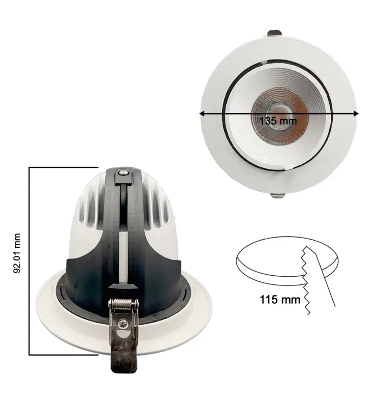 Focus LED encastable i orientable de 25w amb reproducció cromàtica CRI+92. Color seleccionable CCT (3000K, 4000K, 5700K) i Driver Philips. Orientable 60 º graus en vertical i 360 º horitzontal. Angle d’enfocament 24 º