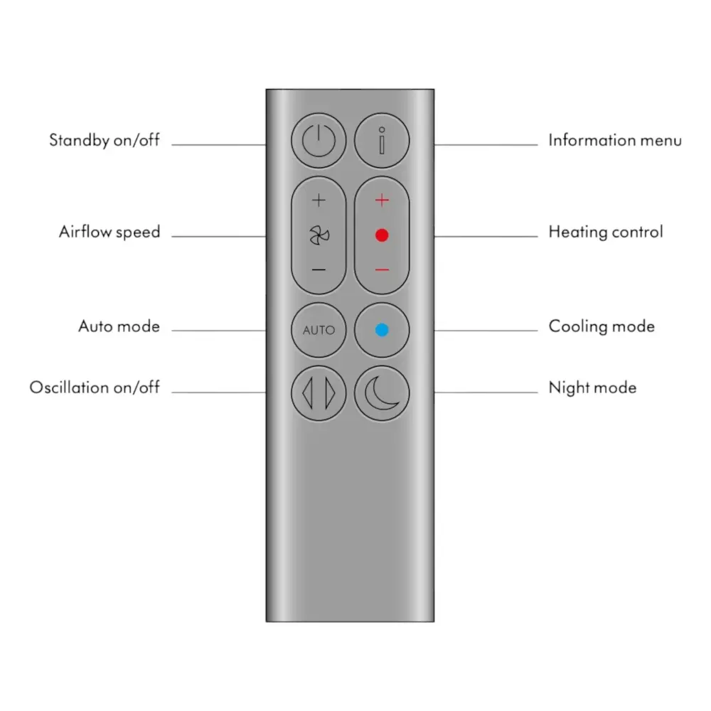 The Dyson 973474-02 remote control is designed for Purifier Hot+Cool HP1 and GEN1 HP10 models, providing direct access to heating, que enfría, airflow, oscillation, and purification functions. It requires no programming when used with compatible units and operates exclusively with supported Dyson Purifier Hot+Cool systems, not with other Dyson fan or heater models.