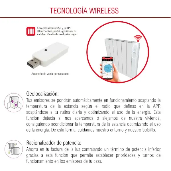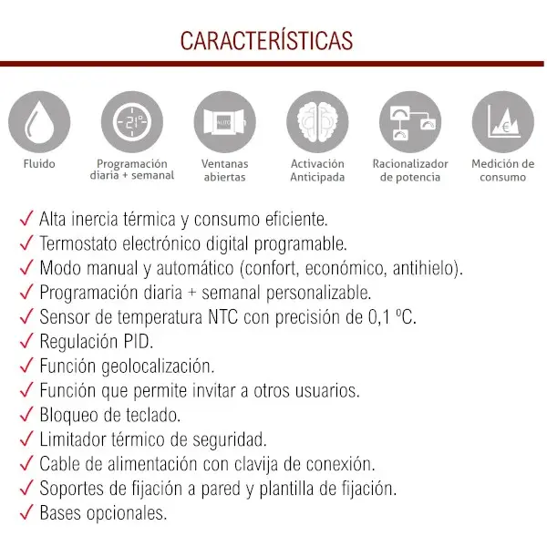 · Programable, diario y semanal.· Función ventanas abiertas: detecta bajada de temperatura y se apaga.· Activación anticipada.· Medición de consumo.· Sensor de temperatura.