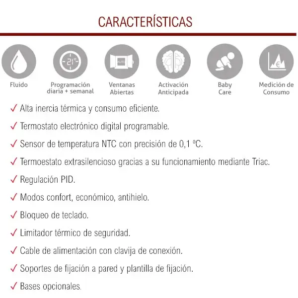 >Control de regulación PID y sistema de corte TRIAC. Permiten una perfecta estabilidad de la temperatura ambiente y un ajustado consumo.