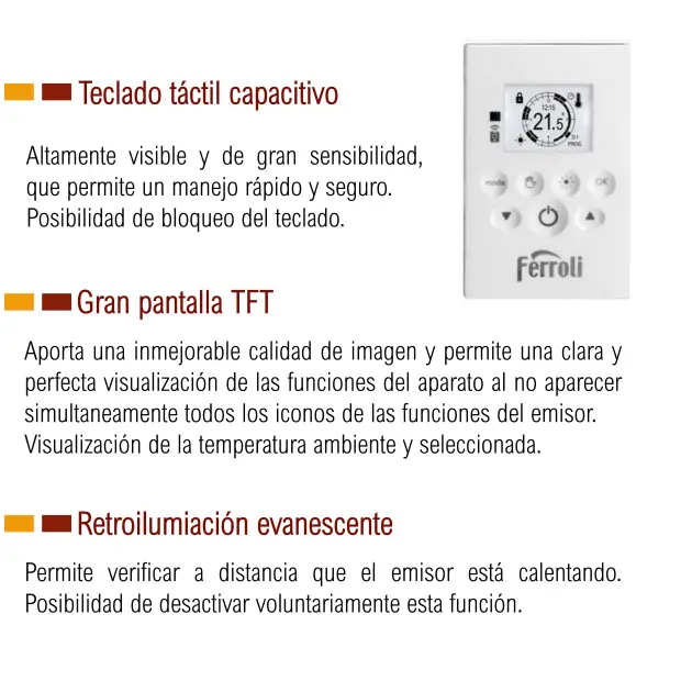 >Pantalla TFT de gran calidad de imagen y una perfecta visibilidad de las funciones del aparato.·Uso videoización de la temperatura ambiente y seleccionada. ·Teclado táctil, altamente sensible, que permite un manejo rápido y seguro. >Control de regulación PID y sistema de corte TRIAC. Permiten una perfecta estabilidad de la temperatura ambiente y un ajustado consumo. >Control de puesta en marcha adaptable consiguiendo la temperatura deseada a la hora precisa. >Función forzado o ausencia que se adapta a los imprevistos volviendo de forma automática al modo programado.>Función ventanas abiertas que desunirá el emisor automáticamente cuando detecte una bajada de temperatura de 4ºC en 20 minutos.