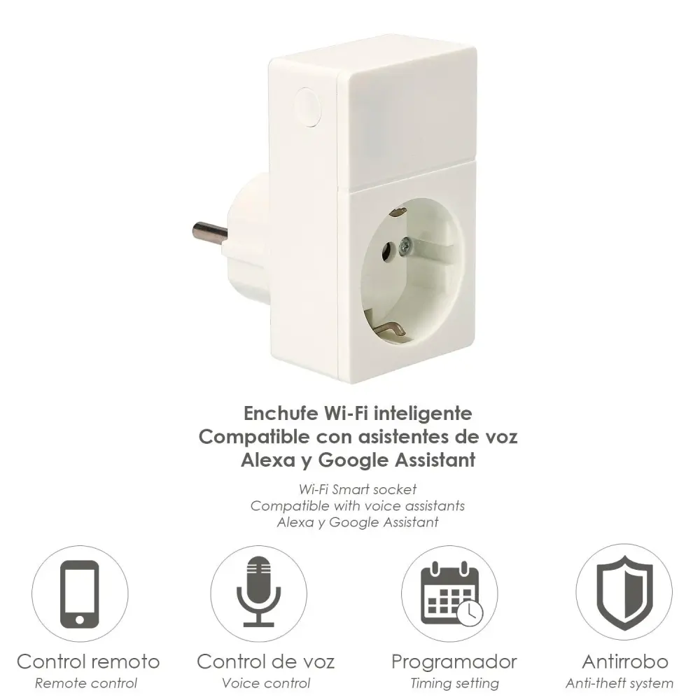 – Enchufe Wi-FI inteligente con función de control remoto se adapta a con asistente de voz Alexa y Google Assistant.