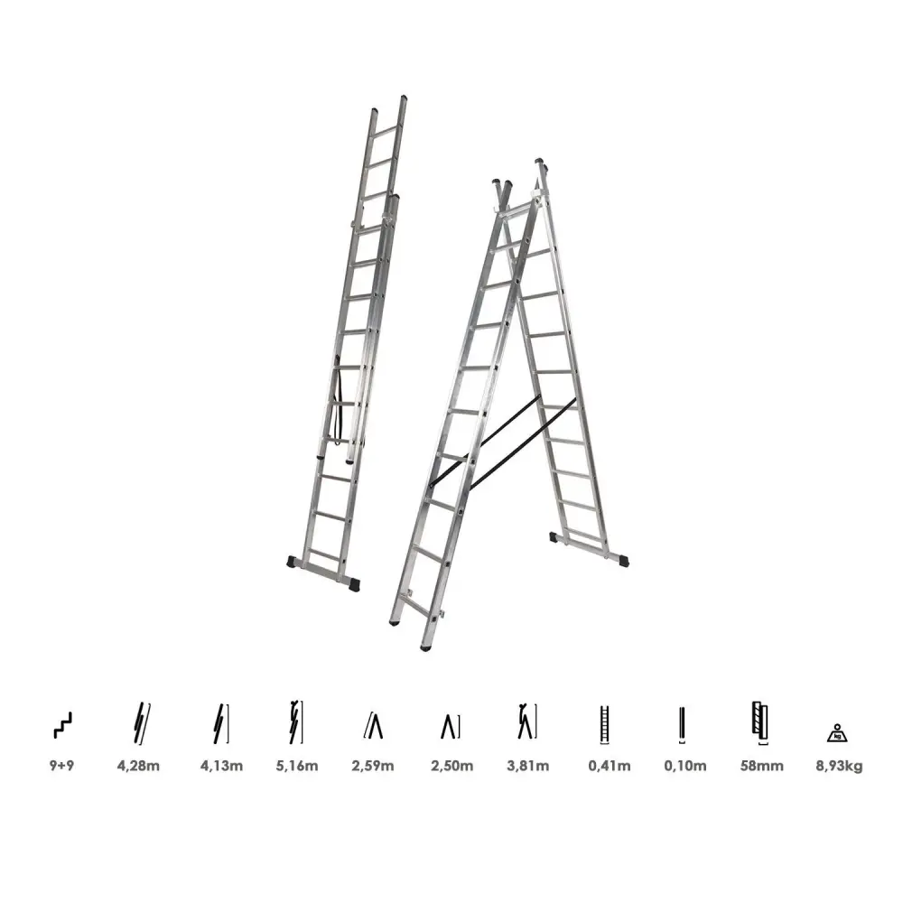 Escalera aluminio 2 tramos 9+9 peldaños. Colapsable, antideslizante, resistente- escalera fabricada en aluminio, con dos tramos de 9 peldaños en cada uno de ellos.- peso:7 kg.- peldaños: 9+9.- medida peldaño: 30×30 mm.- realizada en aluminio.- tope con gancho para mayor seguridad.- se puede plegar facilmente para un cómodo guardado o transporte.- distancia entre peldaños: 280 mm.- no apto para tareas profesionales o intensivas.- muy resistente y con sujección antideslizante- recambios validos para esta escalera en las siguientes referencias:> 23020132: articulación protectora escalera eco.> 23020112: travesaño para escalera aluminio eco.> 23020080: contera travesaño escalera aluminio eco.Especificaciones