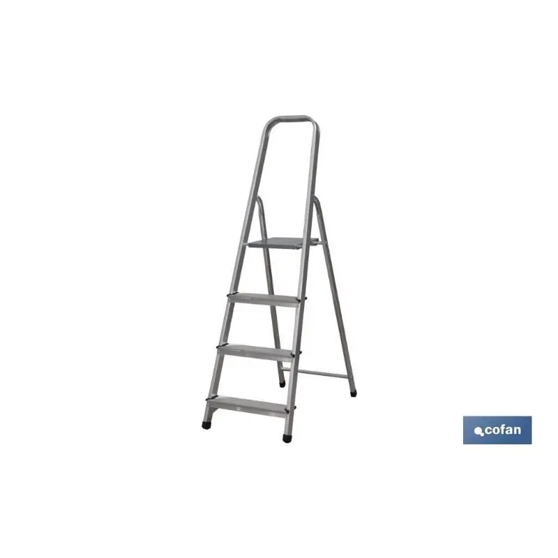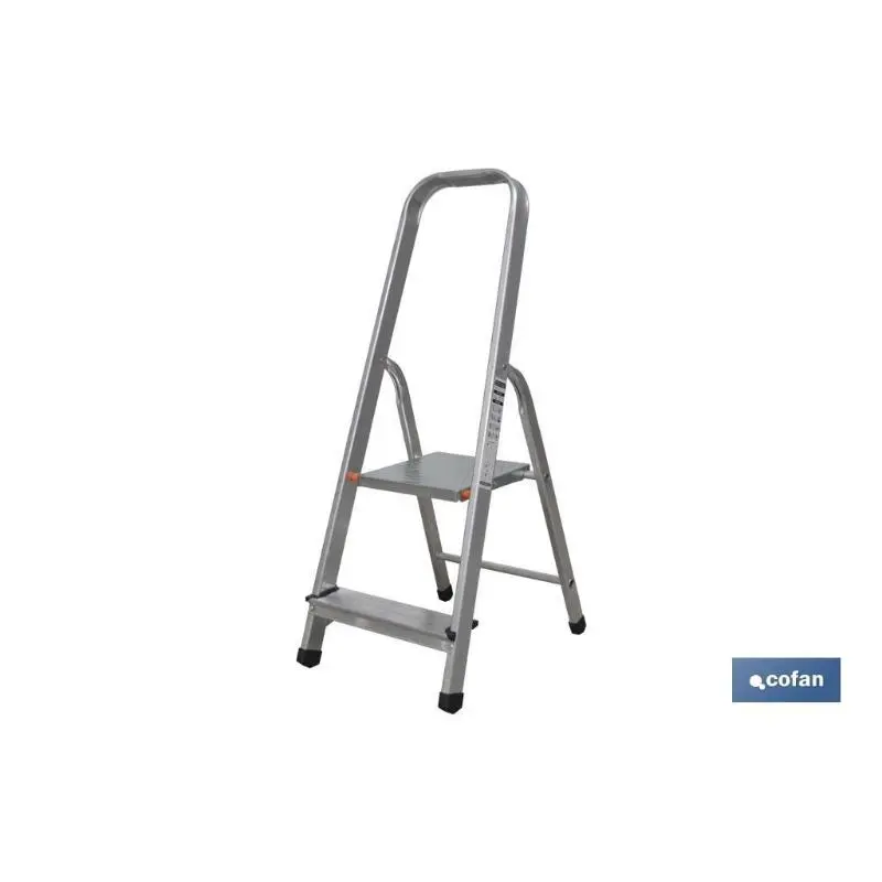 Escalera doméstica de 2 peldaños, con ancho de peldaño de 80 milímetros. norma en 131 para 150 kilos. Cada peldaño cuenta con relieves antideslizantes que aportan máxima seguridad. Fabricada en aluminio de extraordinario calidad.Especificaciones