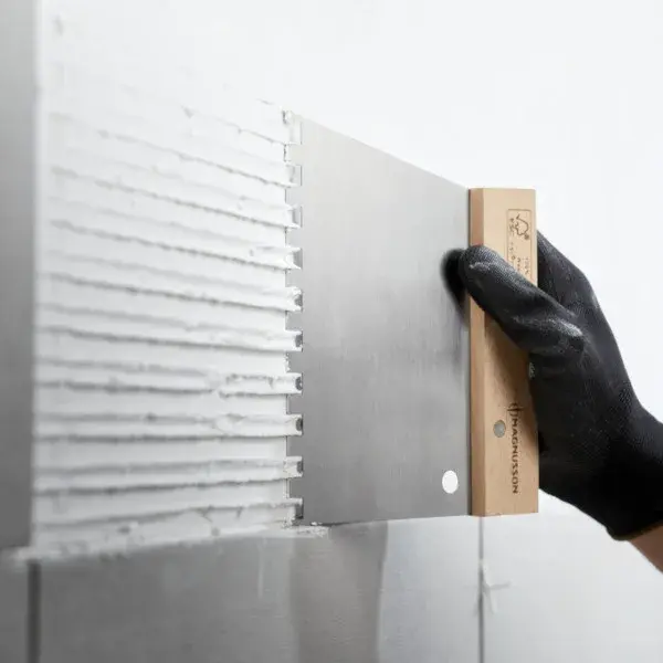 - Las muescas cuadradas de 9 mm distribuyen el adhesivo de manera rápida, sencilla y uniforme en azulejos con un tamaño máximo de 600 x 600 mm, dejando un lecho de 4,5 mm de adhesivo bajo los azulejos.