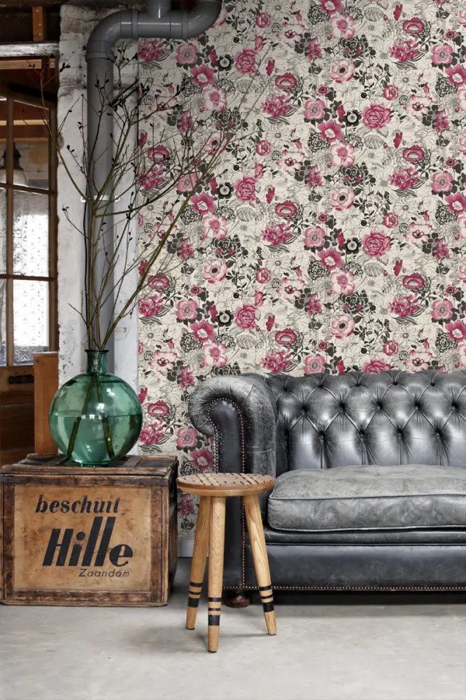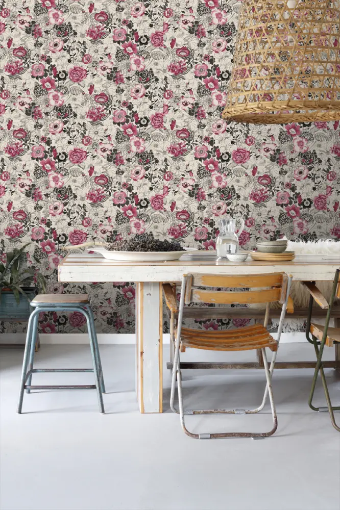 ¿Te encanta el look romántico? Este papel pintado romántico flores en rojo oscuro y beige añade calidez y carácter a tu interior. El aspecto romántico es un estilo ecléctico que combina muebles antiguos con colores pastel, lino, encaje y bonitas flores. Este papel pintado con un toque nostálgico es absolutamente imprescindible si te encanta este estilo suave y soñador.