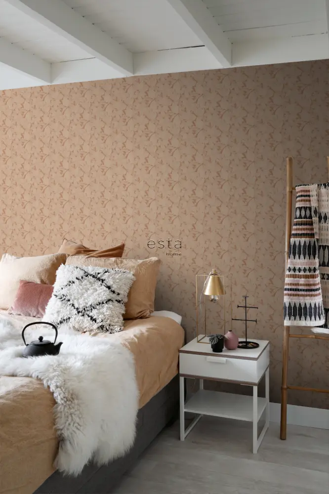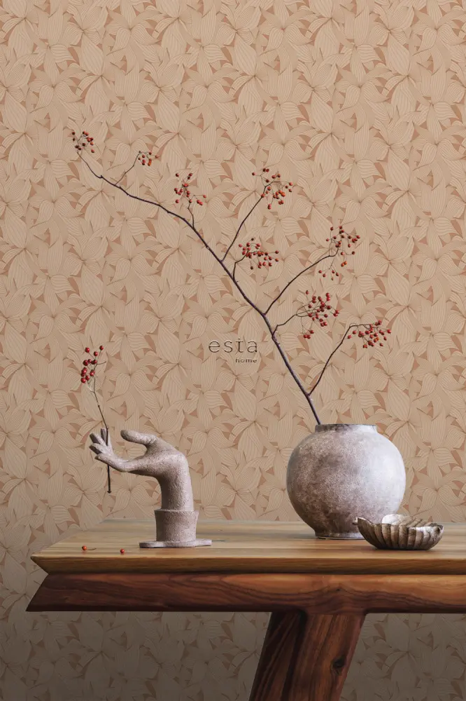 Este moderno papel pintado con hojas dibujadas en rojo barro cocido es un verdadero punto de mira y se adapta perfectamente a un interior moderno. Puedes combinar este papel pintado no solo muy bien con colores claros y materiales naturales, sino también con tonos oscuros (grises) y maderas