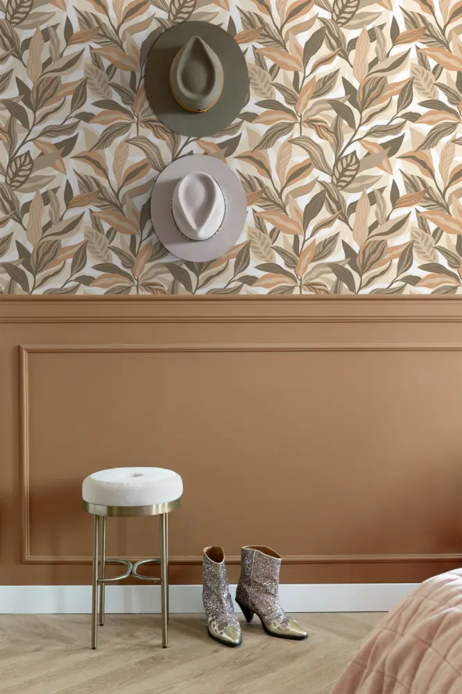Este papel pintado moderno con hojas tropicales en beige construye un ambiente tropical maravillosamente alegre durante todo el año y se adapta perfectamente al estilo botánico tropical. ¿Quieres terminar el look? Une este papel pintado con colores claros, materiales naturales y no lo olvides: muchas plantas