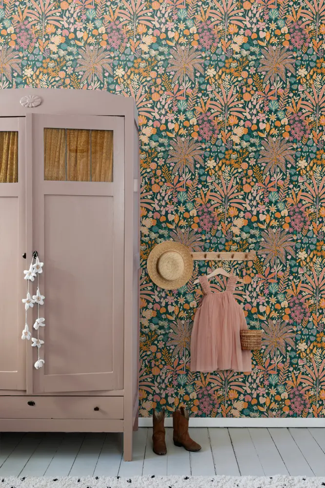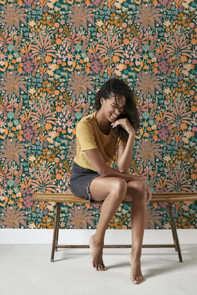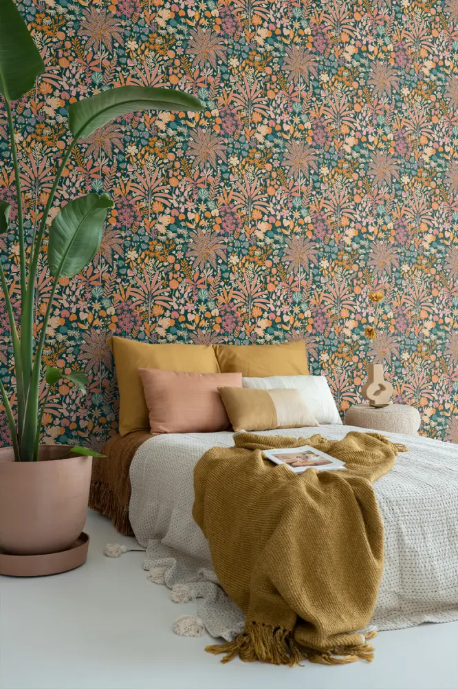 Este papel pintado moderno con hojas y flores tropicales en multi color crea un ambiente tropical maravillosamente alegre durante todo el año y se adapta perfectamente al estilo botánico tropical. ¿Quieres terminar el look? Combina este papel pintado con colores claros, materiales naturales y no lo olvides: muchas plantas
