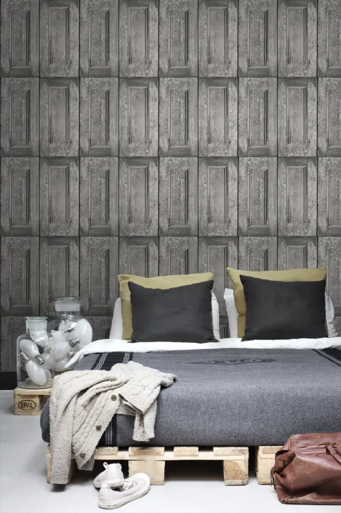 Este papel pintado vintage con puertas de paneles en gris es perfecto para fabricar una asombrosa pared llamativa. Te harás sentir como si estuvieras viajando en el tiempo. Integra este papel pintado con muebles y accesorios de época para lograr el look