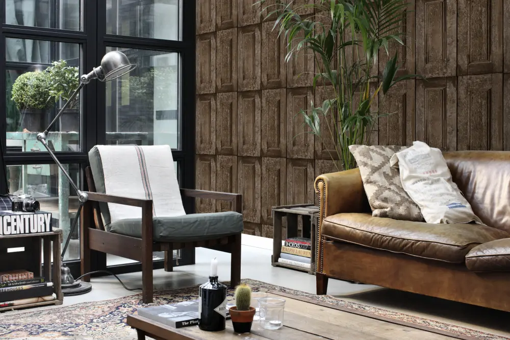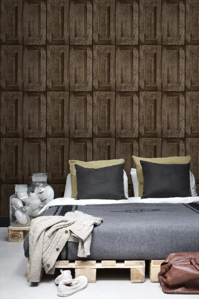 Este papel pintado vintage con puertas de paneles en marrón oscuro es perfecto para fabricar una asombrosa pared llamativa. Te harás sentir como si estuvieras viajando en el tiempo. Combina este papel pintado con muebles y accesorios de época para lograr el look