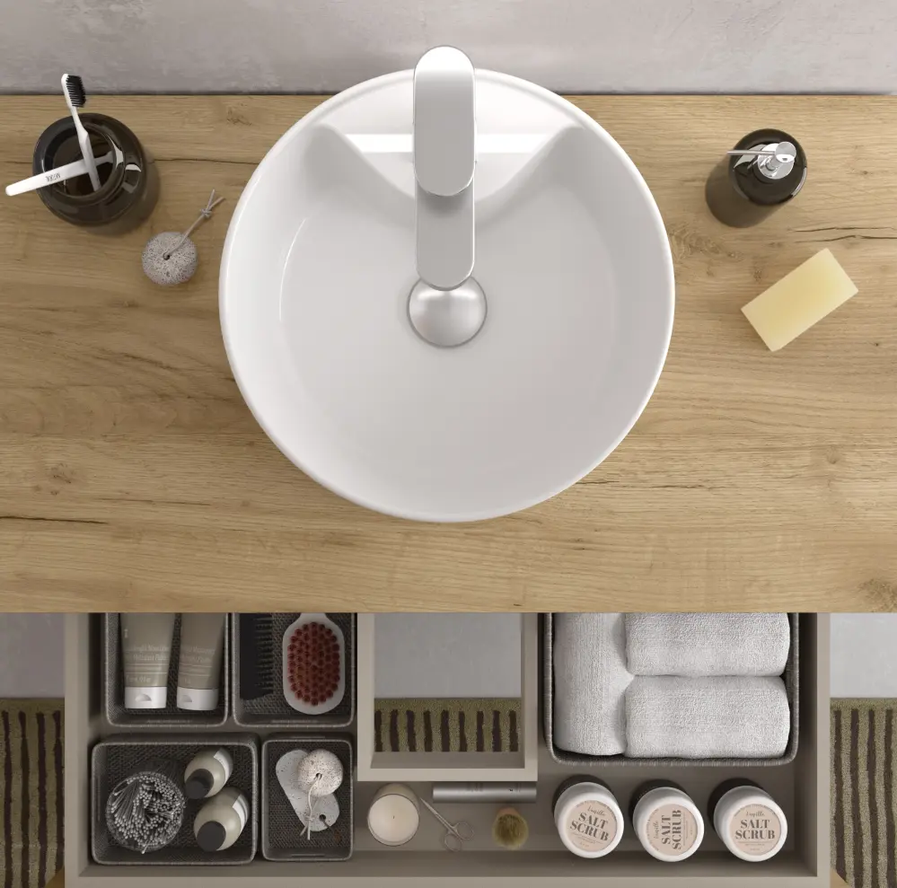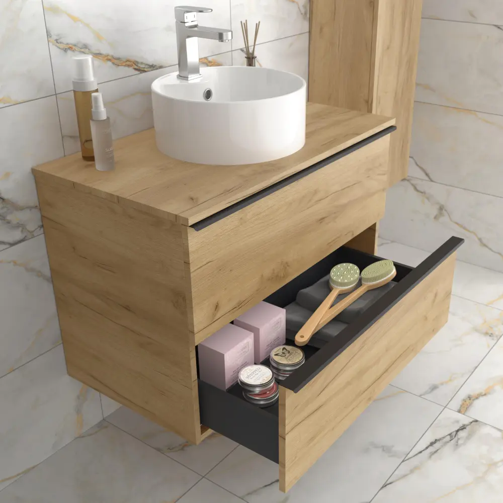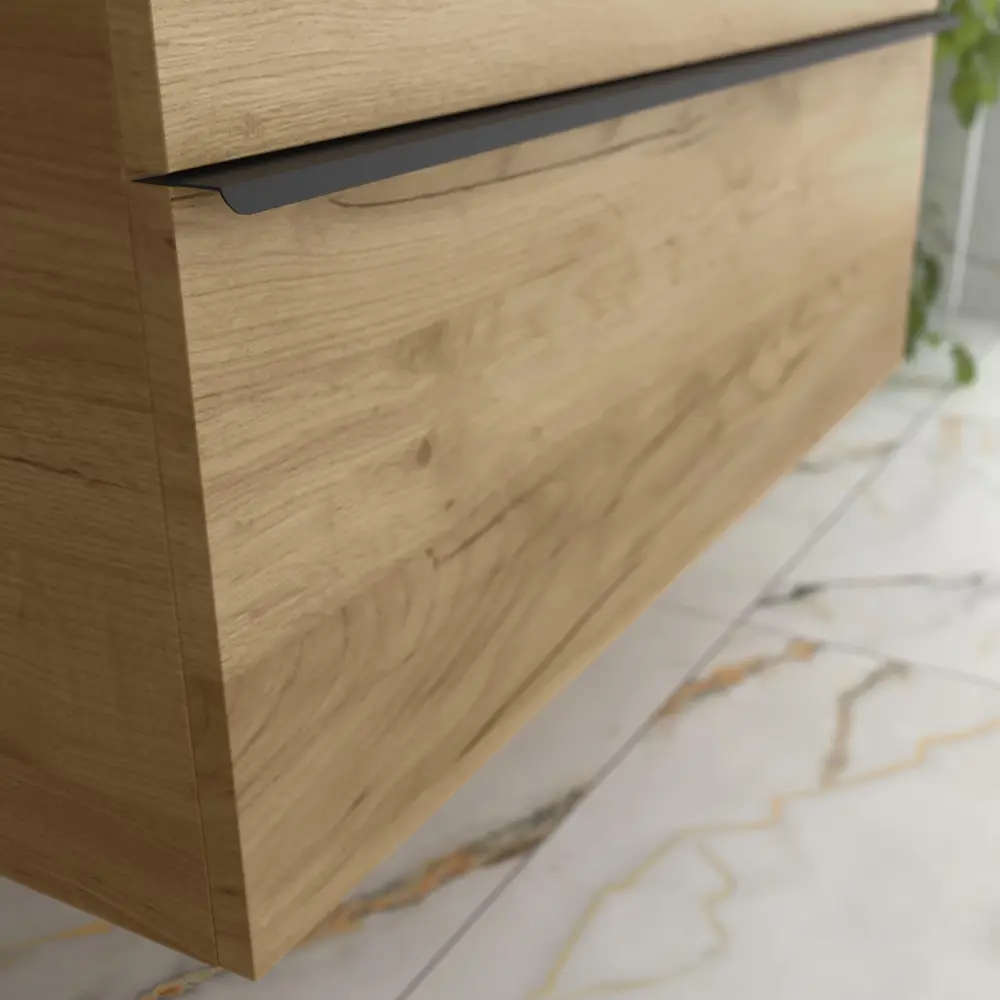 Mueble baño nabua roble con tirador de pestaña | lavabo ✓ Superficie texturizada que evita que los objetos resbalen ✓ Material que no se decolora con el uso frecuente de jabones ► Disfruta de un baño de lujo