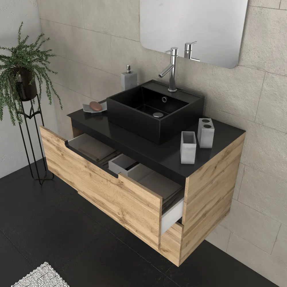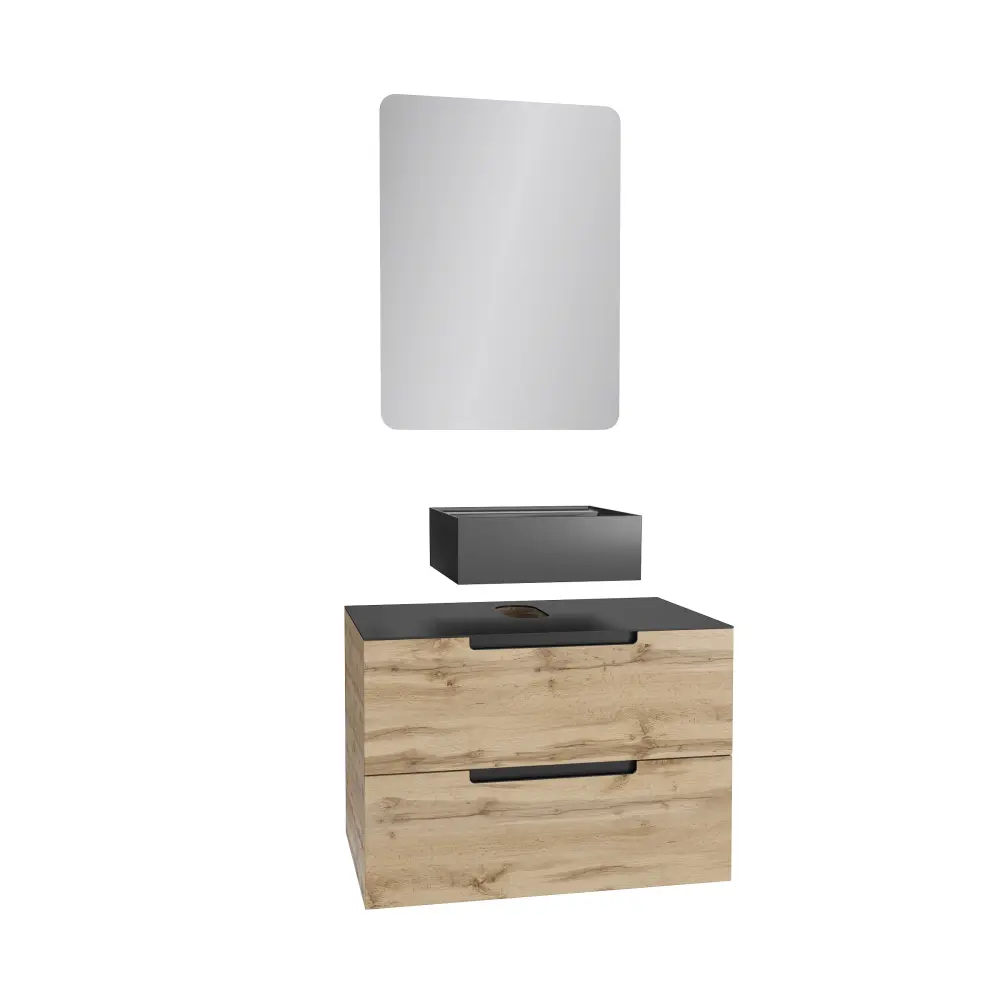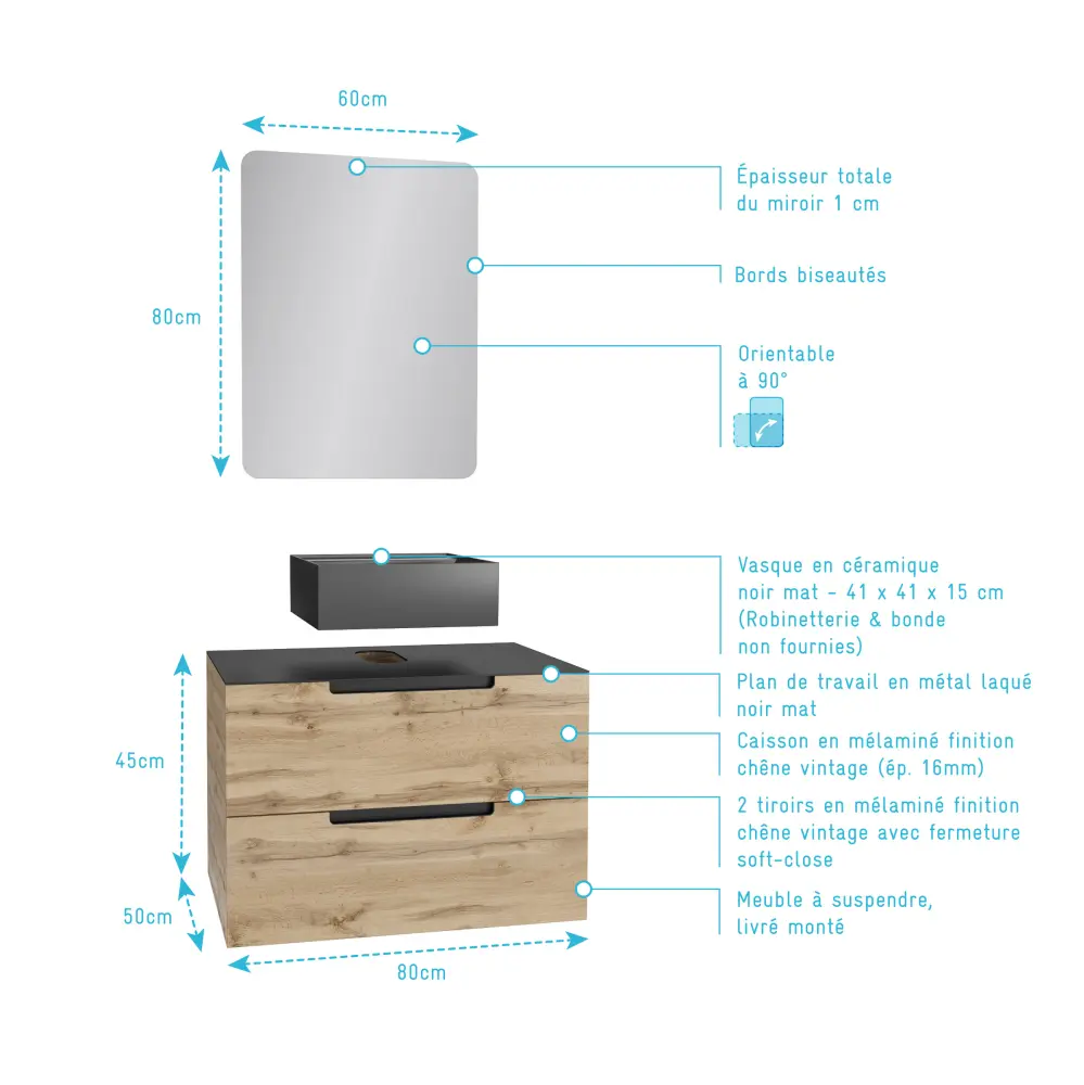 Moderniza tu baño con este mueble de 2 cajones en acabado roble, recubierto con una tapa de acero negro mate. Este juego de muebles está equipado con un lavabo de cerámica negra y un espejo que aportará carácter y un estilo industrial a su baño.