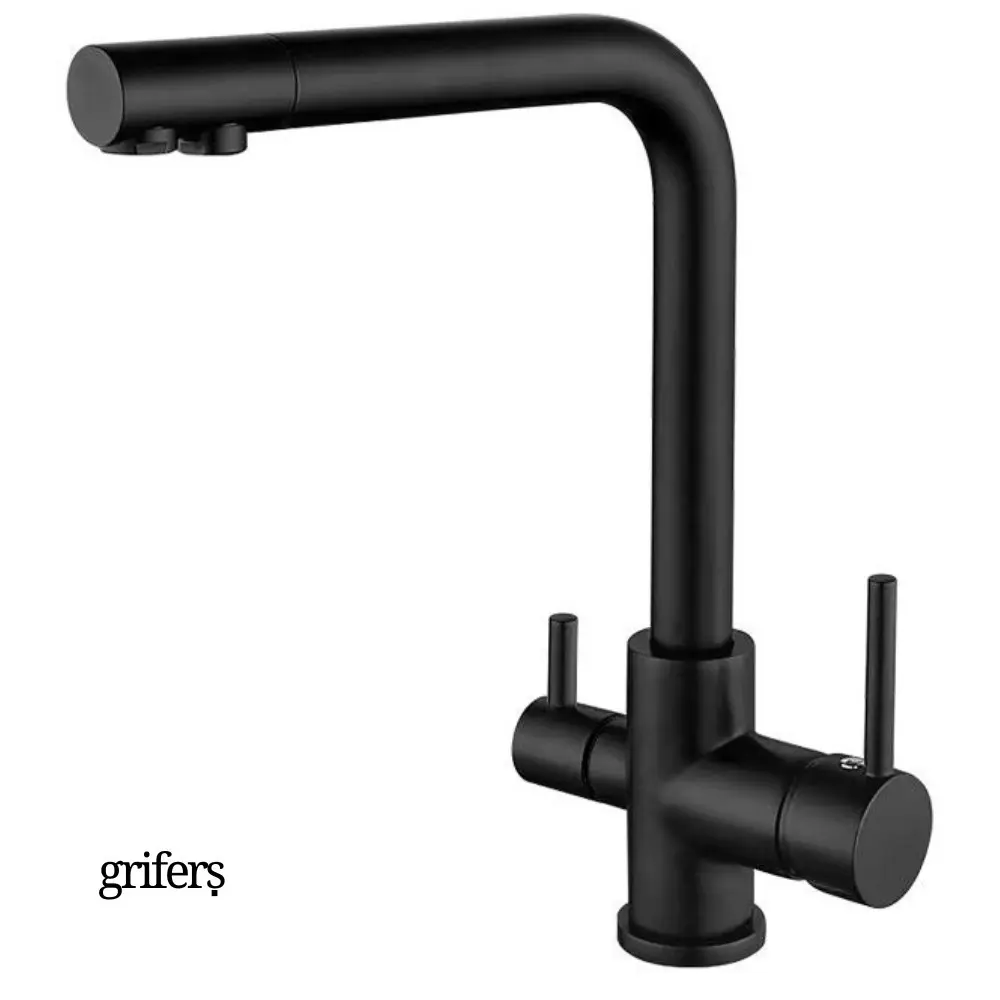 El Grifo Osmosis Negro 3 vías 2 salidas LANTUR COAL GRIFERS es un grifo de alta calidad diseñado para dispensar el agua purificada de manera eficiente y elegante en tu cocina. Con una construcción robusta y duradera de latón cromado, este grifo es resistente a la corrosión y a la oxidación, lo que lo hace óptimo para su uso diario. Este grifo cuenta con tres vías de agua: una para agua fría, otra para agua caliente y una tercera para agua purificada a través de un sistema de ósmosis inversa. Además, tiene dos salidas independientes, lo que te permite preferir entre agua purificada y agua corriente según tus necesidades y sin mezclarse entre ellas. El diseño moderno y elegante de este grifo lo convierte en una adición atractiva a cualquier cocina, y su instalación es sencillo y rápida. Con su acabado cromado de alta calidad, este grifo añadirá un toque de sofisticación a tu cocina mientras te proporciona agua purificada al instante. Si buscas un grifo de alta calidad, elegante y eficiente