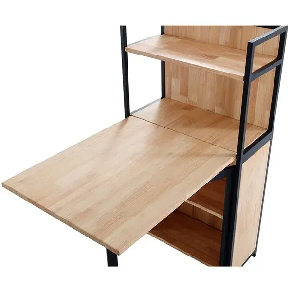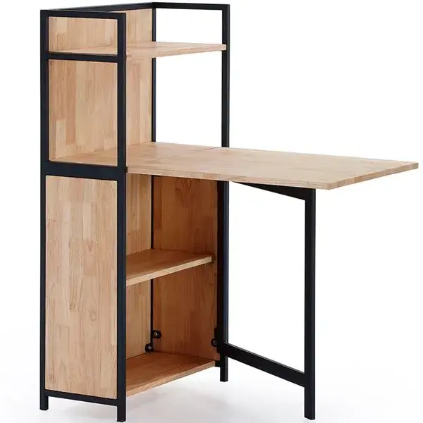 La estantería con mesa plegable Shelf es ideal para espacios reducidos o donde se desee tener una superficie abatible de la que disponer cuando se necesite. Cuenta con un diseño inteligente que aporta funcionalidad y versatilidad. Su función fundamental es de estantería, pero puedes desplegar una mesa de gran tamaño para expandir sus funciones y espacios, como por ejemplo de mesa de cocina, como librería o escritorio en tu habitación o salón. Dispone de un material muy resistente, además tiene un sistema de soporte que se mueve desde la estantería para colocarse por debajo de la mesa. Su estructura esta formada por 4 estanterías de diferentes tamaños, dos de ellos cubiertos por el tablero de la mesa cuando esta inclinada, además sus patas de metal le aportan más soporte y seguridad a todo el mueble.