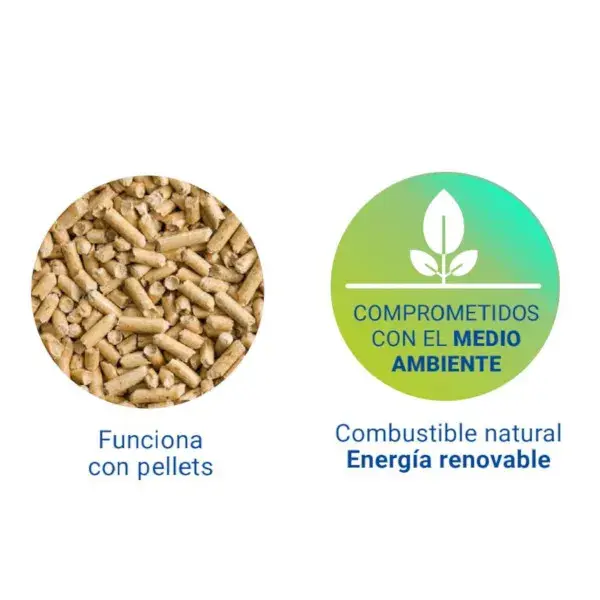 Funciona con pellet, una energía renovable y sostenible de alto poder calorífico. Su capacidad del depósito es de 10 kg con la que obtenerás una autonomía de 5 horas.