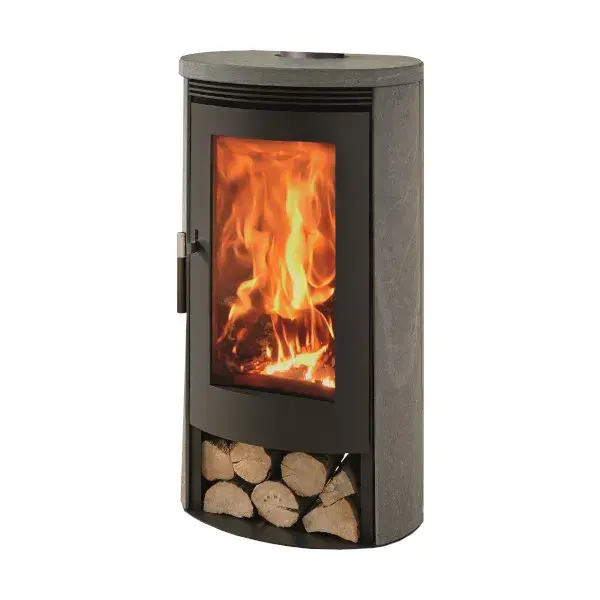El acabado de la estufa de leña de Panadero es moderno, con un recubrimiento en piedra en la parte superior y los laterales y leñero en la parte baja.