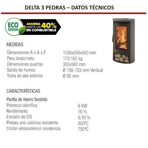 Fabricada siguiendo la normativa Ecodesign, que ha desarrollado una nueva tecnología de aparatos que permiten ahorrar hasta un 40% en leña y ceniza, ser respetuosos con el medio ambiente por las bajas emisiones de CO y prolongar la vida útil.