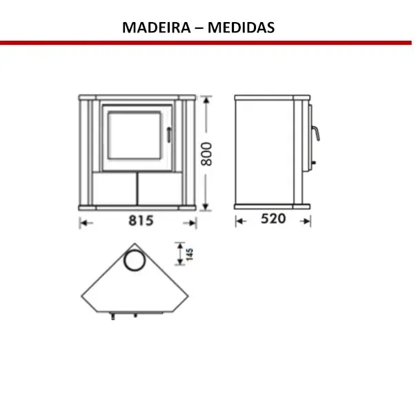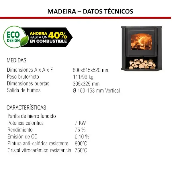 La estufa modelo Madeira de Panadero es adecuada para esquinas, tiene una potencia de 7 kW y permite calentar espacios de 210 m3. Además incorpora un leñero para cómoda ordenación y almacenaje de la leña.
