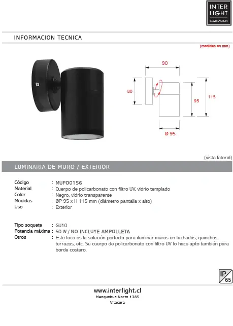 | Potencia máxima: | 50 W / NO INCLUYE AMPOLLETA |