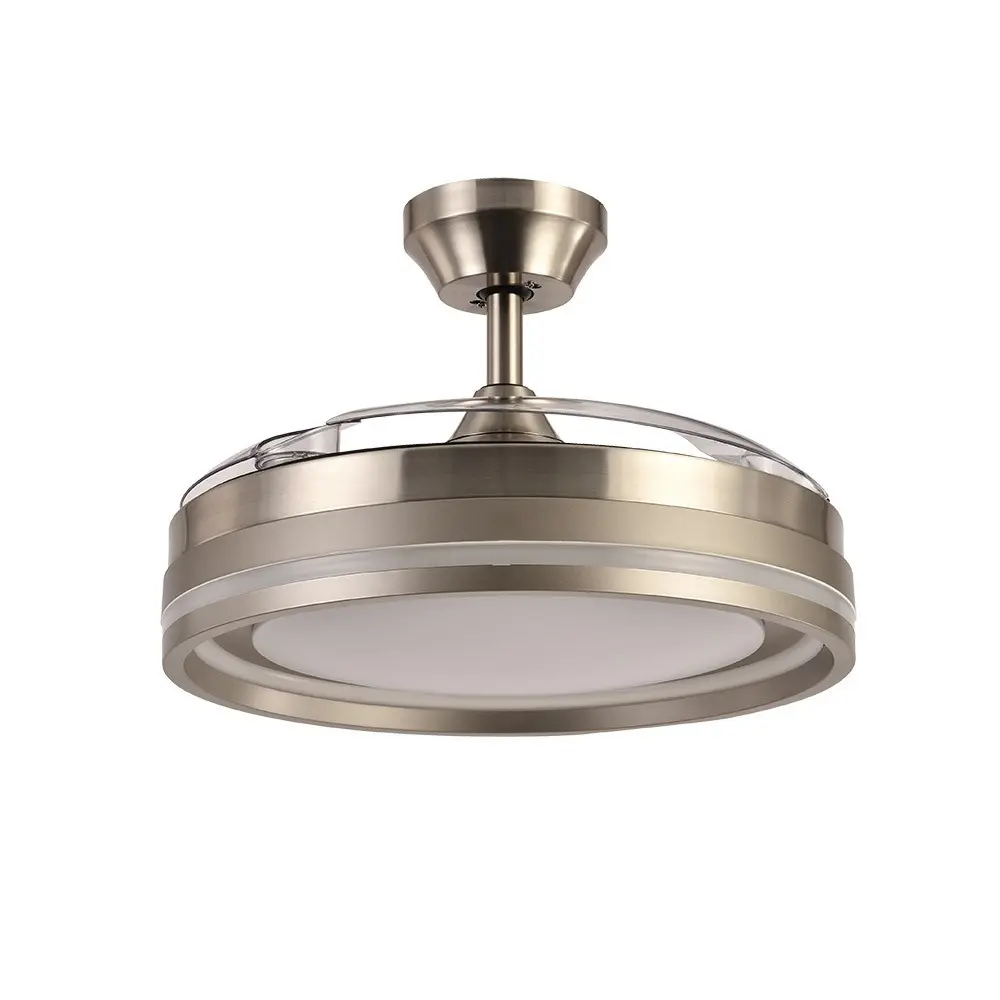 Ventilador DC de la serie CERRATO en color NIQUEL con tres aspas DESPLEGABLES muy resistentes.Realizado en metal, ABS y policarbonato.De diseño moderno y original.Tiene seis velocidades ajustables.Motor DC.Tecnología LED integrada con una potencia de 72W, 7200 lúmenes y 3 TEMPERATURAS DE LUZ (3000-4500-6000K), luz cálida, luz puro y blanco frío.Control de aire verano o invierno.Su medida es de 36,5/49X49 centímetros con las aspas plegadas y de 36,5/49X107 centímetros con las aspas desplegadas, con DOS MEDIDAS DE TIJA para instalar a distintas alturas de techo.Mando a distancia INCLUIDO con MEMORIA DE COLOR y TEMPORIZADOR 1/2/4/8 H.Modelo disponible en color blanco, negro, níquel y cuero. Número de aspas:3Número de velocidades ajustables:6Control de aire para verano o inviernoMedida del diámetro (cm. ):107Tipo de motor: Motor DCTemporizador ventilador:1H < 8HMaterial Motor: Metal / PolicarbonatoMaterial Aspas: ABSColor Motor:NíquelColor Aspas:TransparenteIncluye Tija de dos medidas:1