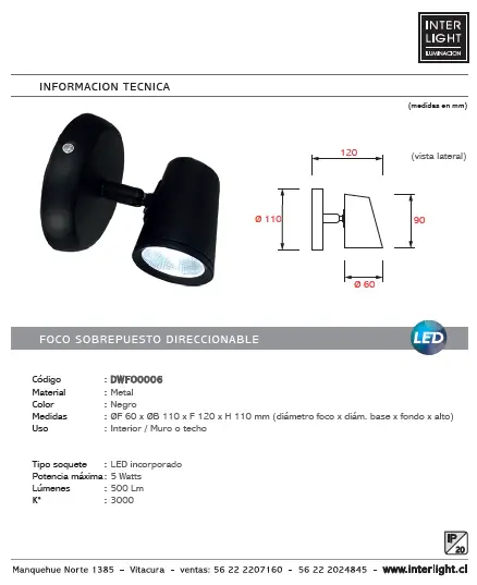 | MEDIDAS: | ØF 60 x F 120 x H 110 mm (diámetro foco x fondo x alto) |