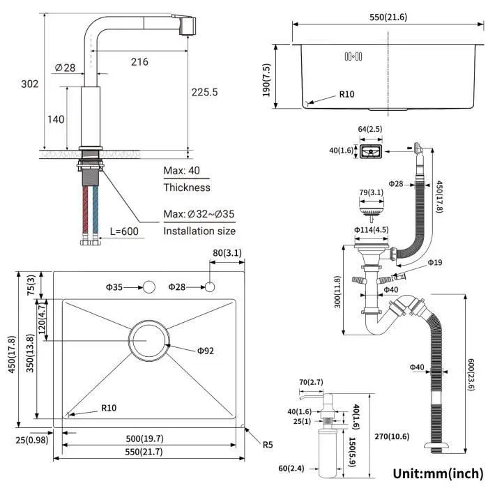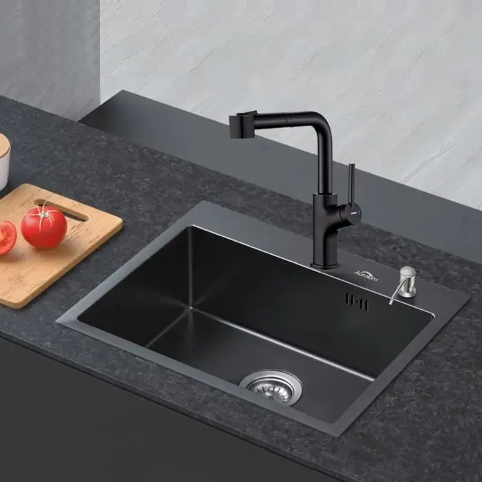 Fregadero de cocina de acero inoxidable negro, efecto antioxidante, apto para mesas de 60 cm de prolongado o más. Mezclador de cocina con rociador extraíble, que satisface tus necesidades diarias. Set de drenaje incluido, efecto antibloqueo y antiolor.Especificaciones