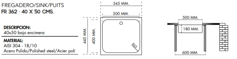 Fregadero de cocina, 1 bandeja, 400 X 500 mm, profundidad 180 mm, diámetro orificio de drenaje 8,89 cm, hecho de acero inoxidable 304 satinado, espesor 0.8 mm, grado alimenticio y altamente resistente a la corrosión y alta temperatura 18/10. Viene con el sistema de drenaje completo (reborde, codo, juntas). Origen España.Especificaciones