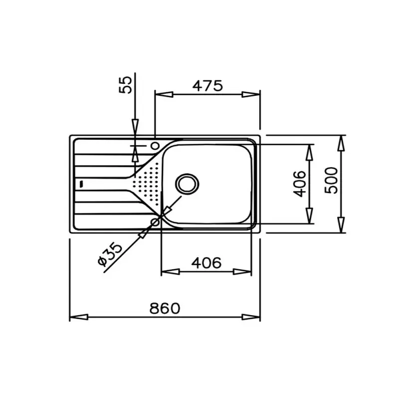Medidas generales: Anchura del producto (mm): 500 Longitud del producto (mm): 790 Profundidad del producto (mm): 195 Masa del producto (Kg): 4,06 Cubeta principal: Longitud de la cubeta principal: 406 Anchura de la cubeta principal: 406 Profundidad de la cubeta central: 195 Otras características: Tela: Resistente corrosiónidable Tipo de instalación: Empotre Tipo de orificio de válvula: 3½» Otros: Base (cm): 50 Disposición del fregadero: Número de tazones: 1 Posición del escurridor: Reversible Complementos: Clips de instalación: Sí Sifón: SíEspecificaciones