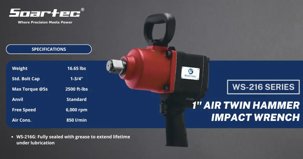 La Llave de Impacto Soartec WS-216 de 1″ cuenta con un robusto mecanismo de doble martillo con escape en el mango, ofreciendo un torque potente para aplicaciones de trabajo pesado. Equipado con un gatillo sin escalas y un regulador de potencia de 6 posiciones, brinda un control preciso para diversas tareas.