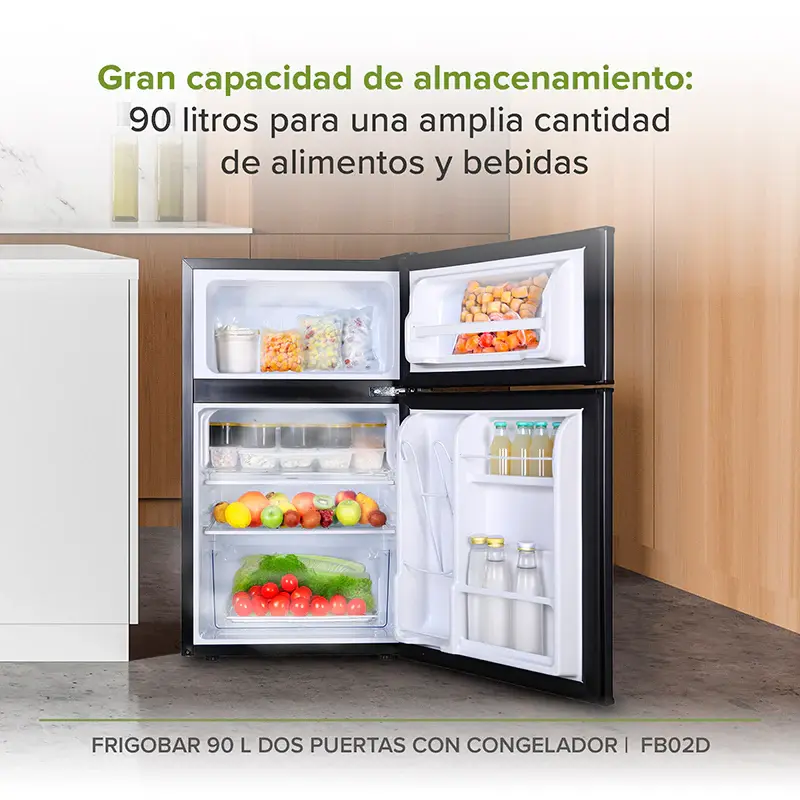 - Gran Capacidad: Con 90 litros, este mini refrigerador es mucho más espacioso de lo que parece, excelente para tu habitación u oficina.