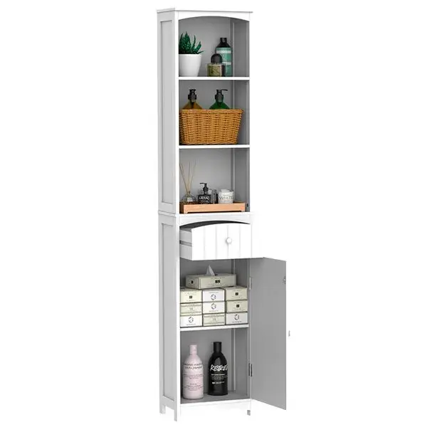 Si lo que necesitas es más espacio para guardar todos los utensilios que tengas en el baño, este armario blanco lacado tan atractivo y vanguardista es la respuesta. Destaca por su diseño vintage y fácil, ideal para decorar tu cuarto de baño. Lleva 3 estantes, 1 cajón y 1 puerta. Ofrece un amplio espacio de almacenamiento y su esbelto tamaño te permitirá ahorrar mucho espacio. Está realizado en MDF, un material resistente a la humedad y viene lacado en color blanco. Este armario multiusos es ideal para colocar en esquinas y es muy práctico para guardar todos tus accesorios de baño, medicamentos o lo que necesites. Sus 4 patas hacen que sea un mueble estable y seguro, su montaje es muy fácil.