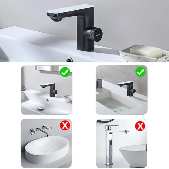 El grifo de lavabo negro LONHEO está equipado con dos sensores infrarrojos inteligentes para abrir y cerrar de forma rápida el agua. También cuenta con un burbujeador que ahorra agua para un uso flexible y sin salpicaduras. La plomería interna está hecha de material PPA, sin plomo e inodoro, para un uso saludable.Especificaciones
