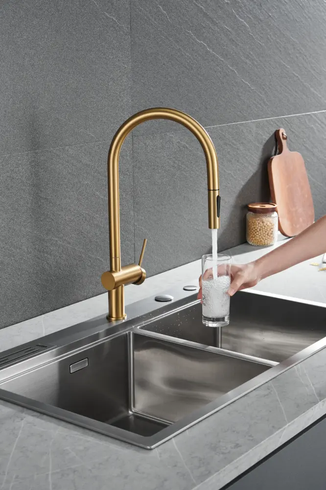 Grifo de cocina monomando extraíble caño grande giratorio 360 ° oro cepillado