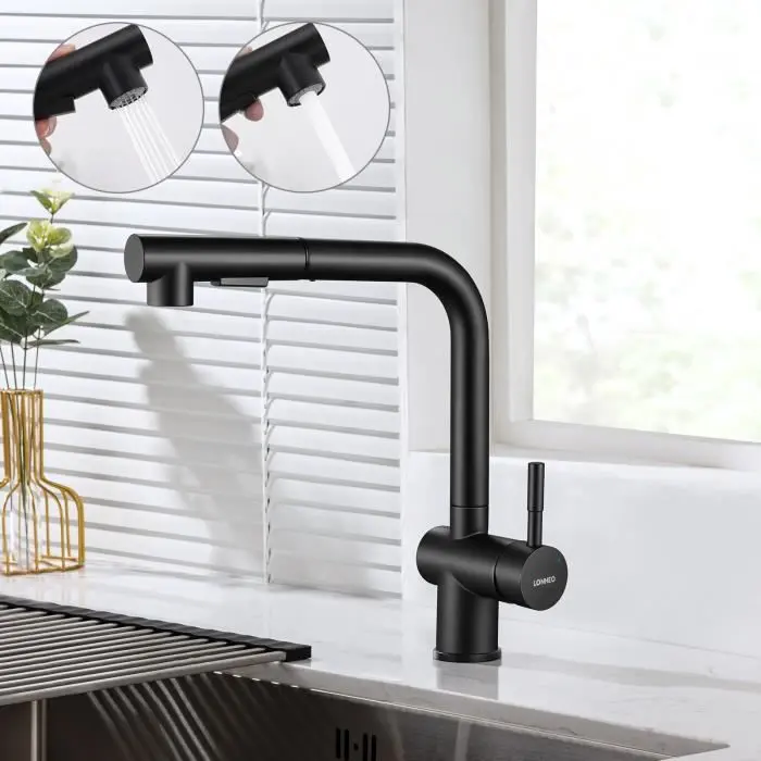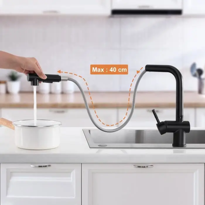 Grifo de cocina de acero inoxidable negro con rociador extraíble, puede tirar del rociador hasta 40 cm, más cómodo de utilizar. Con 2 modos de salida de agua, ¡simplemente presione el botón para optar por el modo que más le convenga!Especificaciones