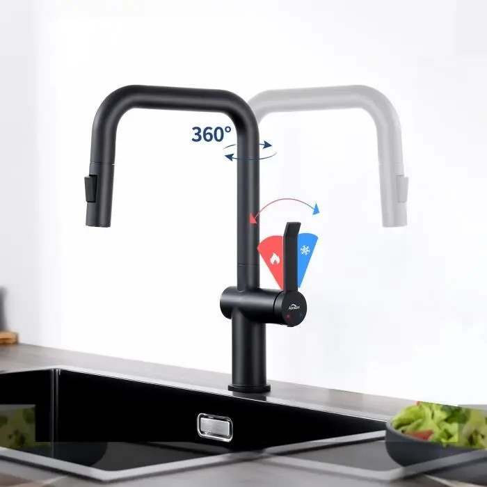 Grifo de cocina negro, mezclador de cocina giratorio de 360°, ★ No se deforma con el agua caliente ★ Espesor suficiente para amortiguar caídas de cristalería → Protege tu cocina de derrames y golpes