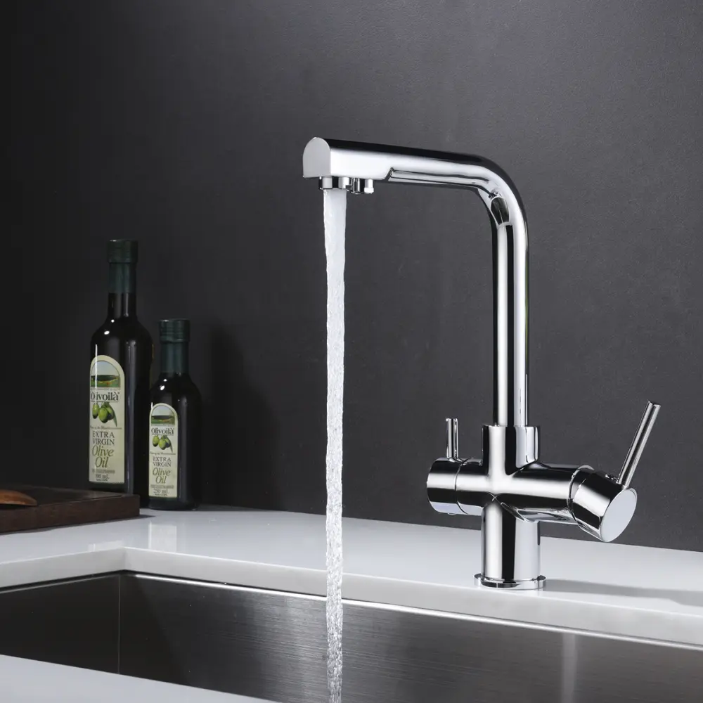 Grifo de cocina monomando de caño alto. Los flexos (latiguillos) van incluidos y tienen una longitud de 50 cm, los cuales gracias a su flexibilidad nos dan una gran facilidad para evitar cuestións con las medidas y el diseño de la cocina. Las dimensiones del grifo son 23 cm de amplio x 33 cm de alto. Su base mide 5,5 cm de diámetro.Cuenta con 2 vías de agua, una para la salida de agua del sistema de tuberías (normal) y otra por si se tiene agua filtrada (osmosis).Ambas salidas de agua se encuentran en el cabezal del caño, donde el agua corriente sale por el primer aireador y la osmosis por el segundo.La activación del agua corriente se hace en la maneta grande lateral de la grifería y la salida de osmosis se activa con la otra maneta más pequeña situada en el otro lateral del caño (como se ve en la imagen).Contiene un cartucho de discos cerámicos de 35 mm en la maneta para obtener una mayor precisión de caudal y temperatura del agua.Especificaciones