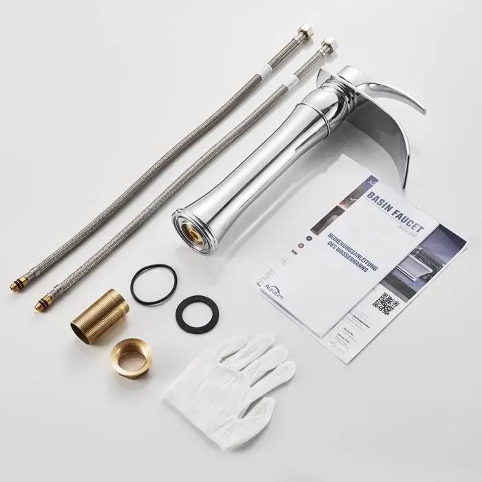Grifo para lavabo en cascada con caño alto auralum ● Compatibilidad con sistemas de desagüe doble ● Canto redondeado para mayor seguridad en el baño ▶ Elige durabilidad y estilo en tu lavabo