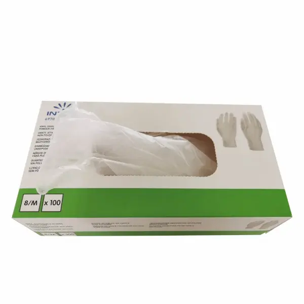 Caja de 100 guantes desechables. De material 100 % vinilo, no transpirable.Puño con borde enrollado.Son resistentes al agua y perfectos para manipulación precisa y preparación de alimentos.