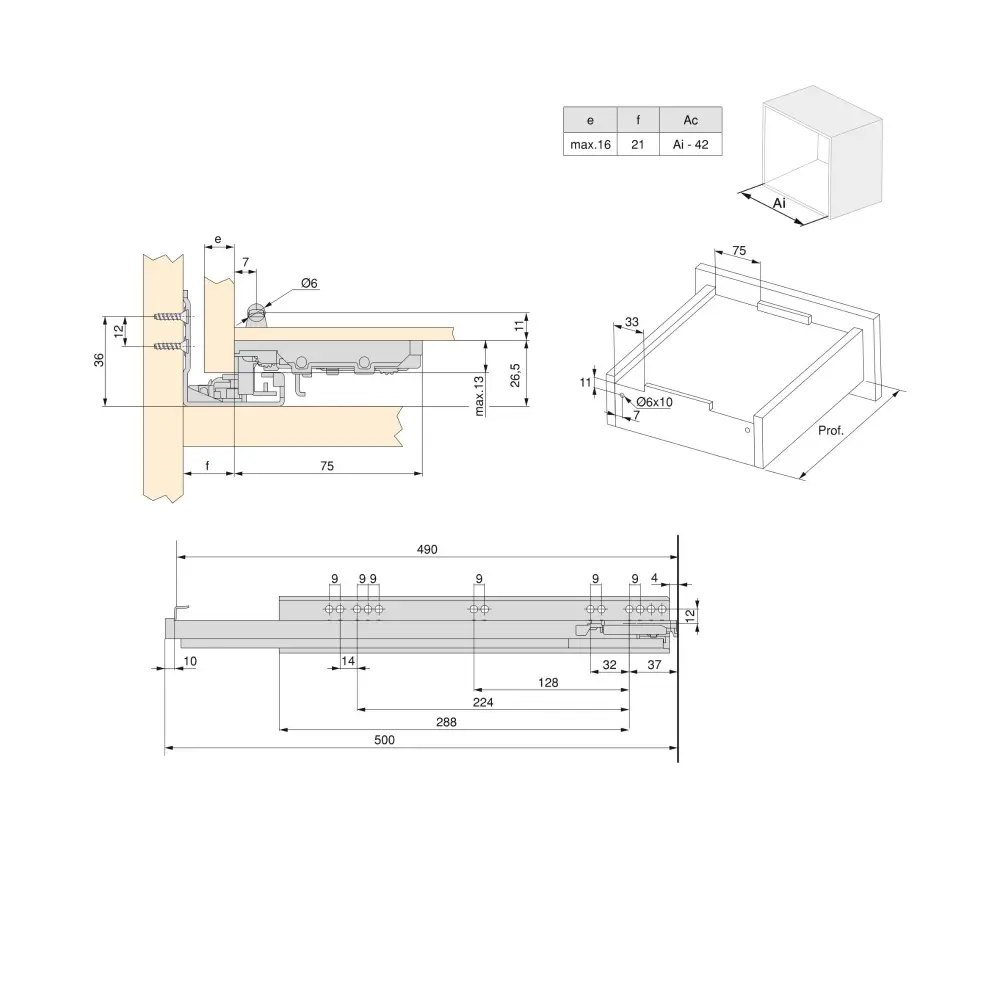 Guías de extracción total sincronizadas para cajones de profundidad 490 mm. Diseñadas para muebles de hogar.Poseen enganche para simplificar el montaje/desmontaje rápido del cajón sobre las guías.Regulación en tres direcciones, vertical +3 mm, horizontal ±1,5 mm y profundidad +3 mm.Disponen de autocierre y pistón amortiguador en ambas guías, que proporciona un cierre flexible del cajón.Carga máxima de 30 kg. Se suministra por juegos completos con mano derecha y mano izquierda.Su rodadura se realiza sobre rodillos de delrin que permiten el guiado en sentido horizontal y vertical.Especificaciones