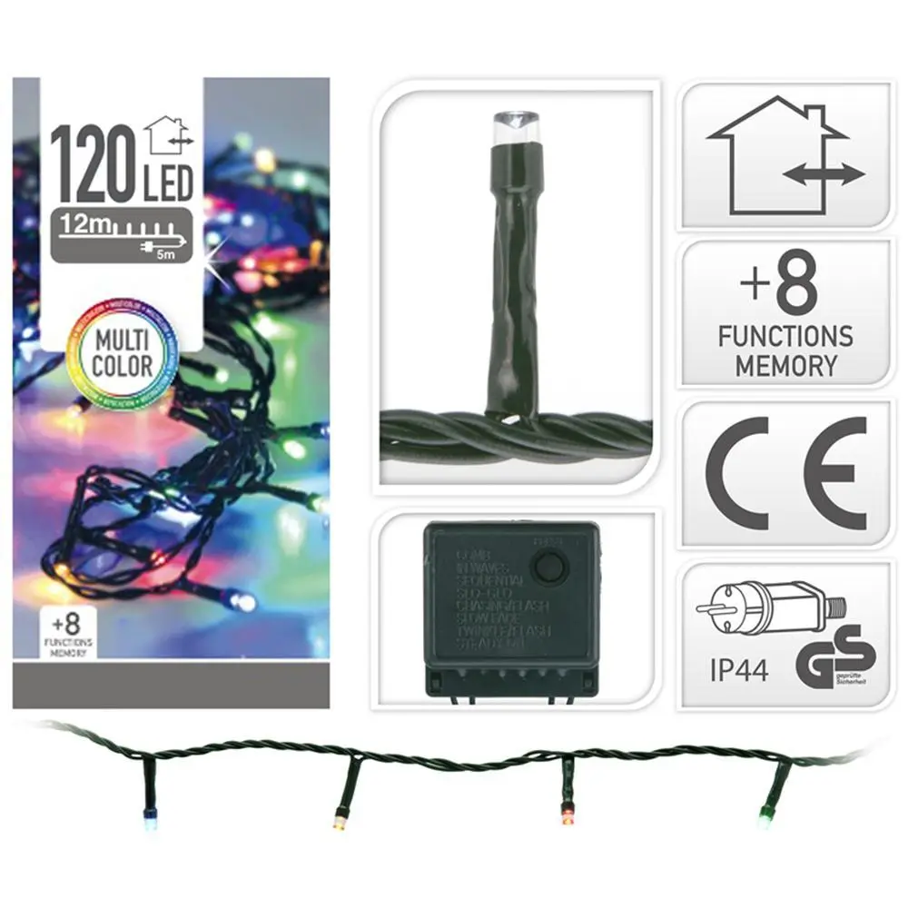 Guirnalda 120 leds 12 metros 8 funciones multicolorguirnalda 120 led de varios colores multifunciónpara exterior e interior5 mm de cable verde10 cm entre ledscon programador 8 funcionescon memoriaadaptador ip44.Especificaciones