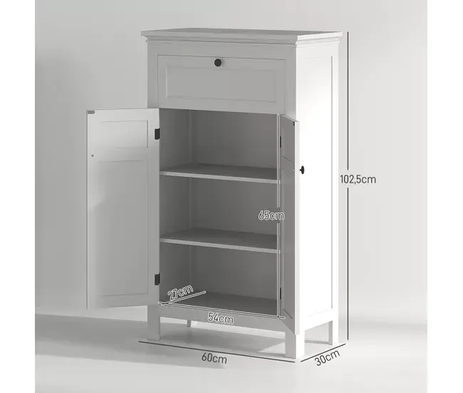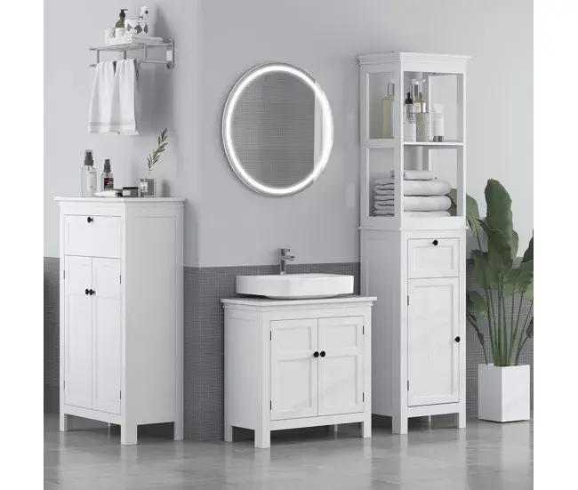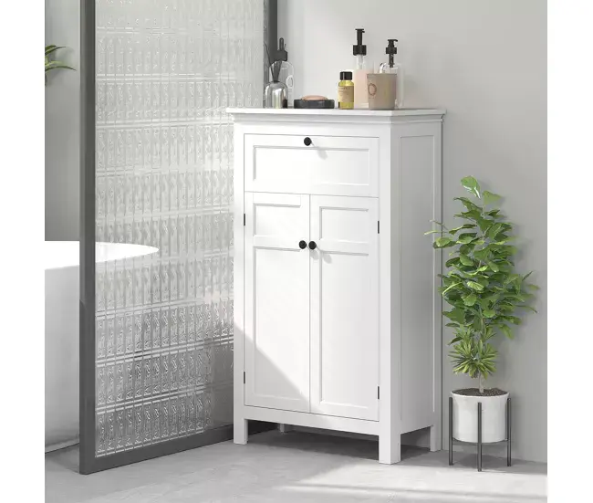 Organiza tu baño con este elegante mueble de HOMCOM. Con una amplia encimera, un cajón y un armario con estantes ajustables, este armario de baño proporciona un excelente espacio de almacenamiento. Su diseño elegante, su color neutro y los tiradores negros aseguran una combinación armoniosa con cualquier decoración de baño.