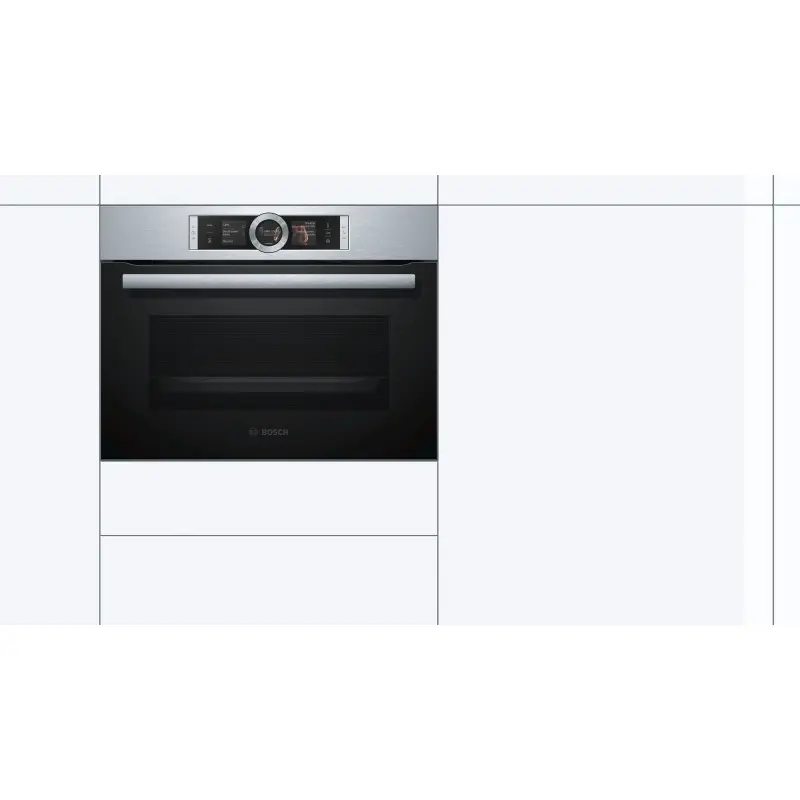 Bosch CSG636BS3, Serie 8. Display TFT touch control con imágenes y textos ? Control electrónico de temperatura ? Cocción al vapor 100% (depósito de agua 1 litro) ? Cocción tradicional con vapor añadido (depósito de agua 1 litro) ? Assist, asistente de cocción con más de 100 recetas ? Calentamiento profesional 4D, con turbina EcoSilence ?12 modos de calentamiento ? Funciones especiales: fermentar masas, regenerar alimentos, cocción suave a baja temperatura, sostener caliente, precalentar vajilla, precalentamiento rápido, programación ? Puerta abatible con apertura y cierre amortiguado SoftMove, 3 cristales y temperatura exterior de 40ºC ? Panel trasero autolimpiante ? Iluminación interior por LED ? Rendimiento energético A+* ? Complementos: 3 bandejas específicas para cocción al vapor, 2 bandejas esmaltadas (profunda y plana) y parrilla Energía: Clase de eficiencia de energía: A+ Consumo de energía (convencional): 0,73 kWh Consumo de energía (convección forzada): 0,61 kWh. Talla: Espacioso: