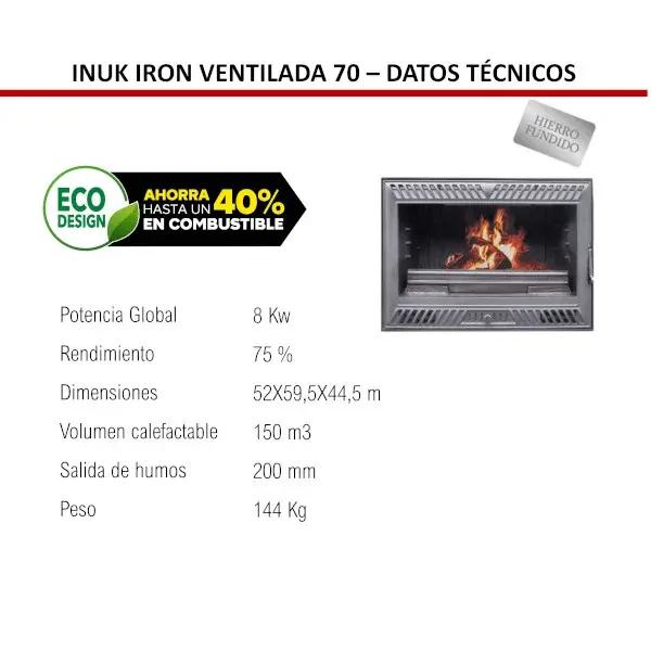 > Su ventilación forzada termostática permite calentar de forma rápida y extraer toda la energía de la leña.