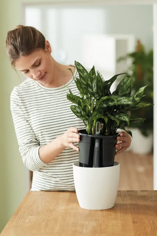 El inserto es un sistema de riego fácil que protege que su planta reciba la cantidad correcta de agua en el momento exacto. El medidor de agua en el dispositivo indica cuándo debe llenarlo con agua, y su planta se cuidará sola durante las próximas semanas. ¡Como dijimos, fácil! El inserto se adapta a la mayoría de las macetas interiores de Elho y muchas otras materas, incluidas las de cerámica. El inserto proporciona la máxima comodidad para la planta: todas las alegrías de mantener las plantas sin ninguna molestia.