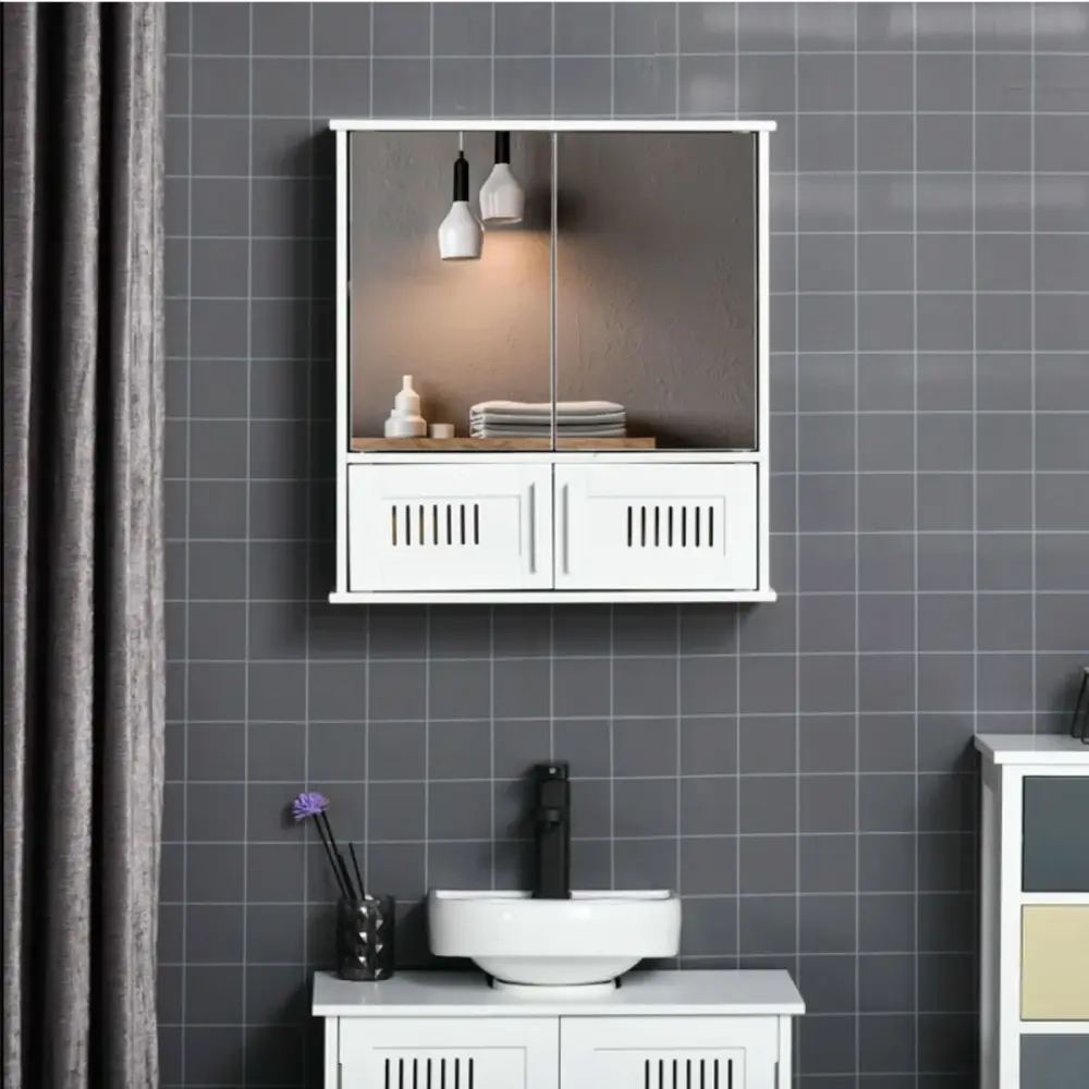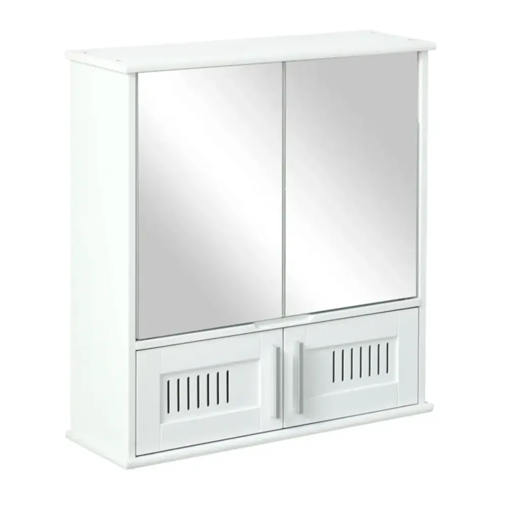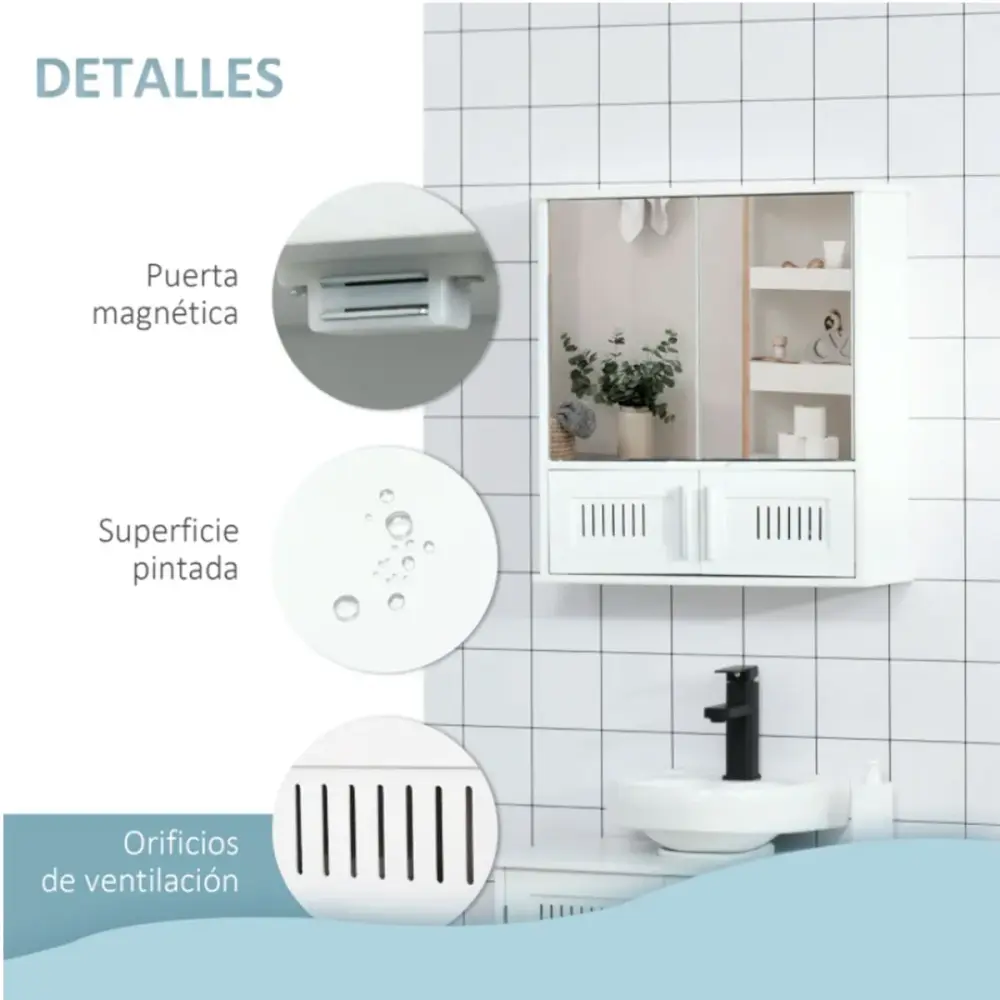 Este armario de baño con espejo deKleankin con instalación en pared es perfecto por su tamaño compacto y su bonitodiseño. Está creado con MDF de primera calidad y espejo de vidrio. Cuenta con 4puertas, 2 superiores con espejo y tiradores tipo uñero; y 2 inferiores con unfrente llamativo y distintivo con ventilación y 2 cómodos tiradores de aluminio.En su interior descubrirás, 2 estantes en la parte superior, 1 de ellosajustable; y otro estante más en la parte inferior. Todas las puertas disponende cierre magnético para evitar golpes. En ellos podrás guardar tus cremas,perfumes, maquillaje, maquinilla de afeitar, etc. Su sofisticado diseño hará quecombine con cualquier tipo de decoración que tengas. Además, es muy sencillo delimpiar y de instalar en la pared gracias a su claro manual de instrucciones. ¡Nolo dudes más y consigue ese estupendo armario para tu baño o aseo a un precio irresistible!