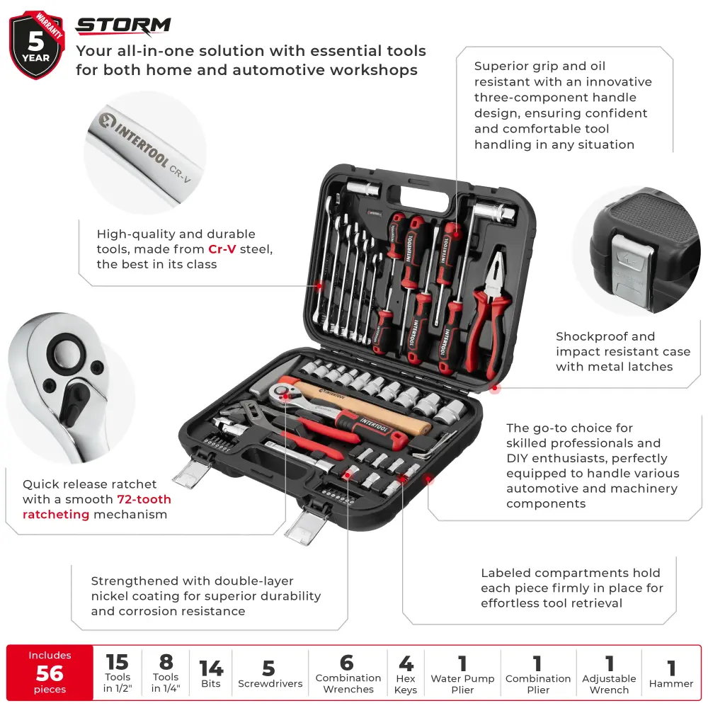 Este juego de herramientas métricas de 56 piezas incluye dados con entrada de 1/4” y 1/2” (8-27 mm, más dados para bujías), llaves, destornilladores con acero S2, puntas, alicates y un martillo. Fabricado en acero al cromo vanadio duradero con un acabado cromado pulido a espejo para resistencia a la corrosión. Ideal para mecánicos de automóviles, aficionados al bricolaje y